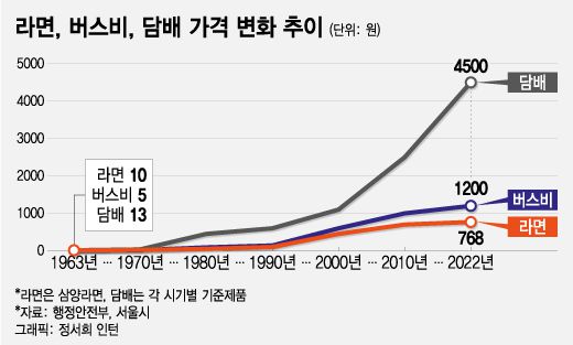 60년이 지난 현재 삼양라면 가격은 768원으로 버스 기본요금 1200원(카드 이용 시)보다 432원 저렴하다. 이마저도 지난해 말 가격을 9.3% 올려 좁혀진 것이다. 올해 하반기 버스 기본요금이 200~300원 오르게 되면 라면값의 2배가 될 수 있다.