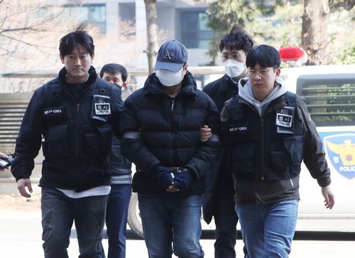 경찰 승합차에서 내린 그는 포승줄에 묶인 채 수갑을 찬 상태였으며 모자와 마스크로 얼굴을 가렸다.