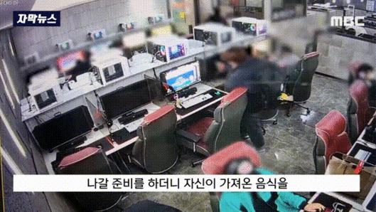 손님에게 외부 음식 반입 금지 안내를 하는 PC방 직원. (MBC 갈무리) |