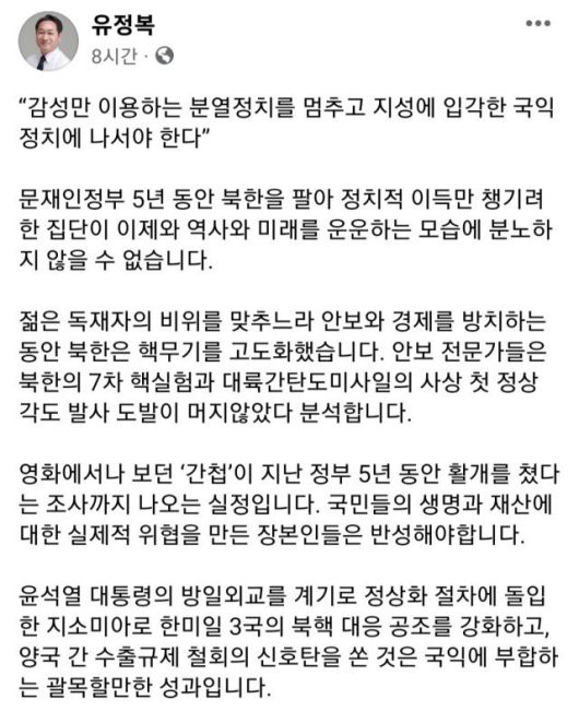 유 시장은 이 글에서 “문재인 정부 5년 동안 북한을 팔아 정치적 이득만 챙기려한 집단이 이제 와 역사와 미래를 운운하는 모습에 분노하지 않을 수 없다”며 “영화에서나 보던 간첩이 지난 정부 5년 동안 활개를 쳤다는 조사까지 나오는 실정이다. 국민들의 생명과 재산에 대한 실제적 위협을 만든 장본인들은 반성해야 한다”고 주장했다.