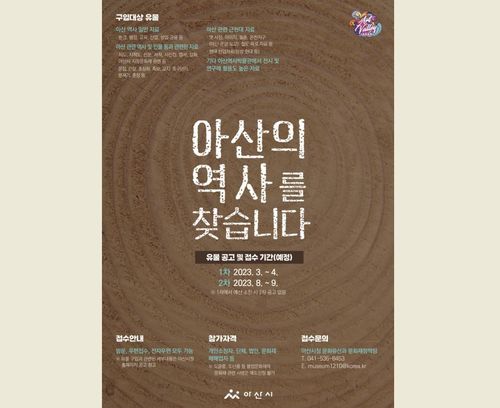 (아산=연합뉴스) 유의주 기자 = 충남 아산시는 민선 8기 공약사업인 아산역사박물관(가칭) 건립을 위해 전시·교육·연구자료로 활용될 지역 유물을 공개 구매한다고 20일 밝혔다.