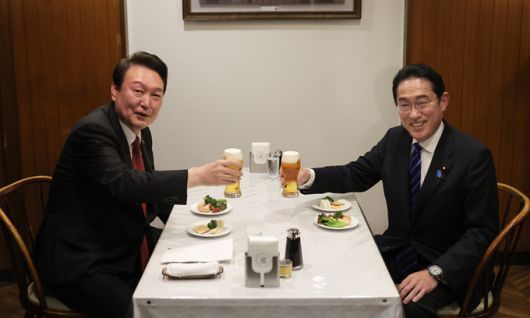 윤석열 대통령과 기시다 후미오 일본 총리가 지난 16일 친교 만찬을 마치고 도쿄 한 식당으로 자리를 옮겨 건배하고 있다. 뉴시스 |