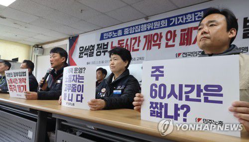 (서울=연합뉴스) 홍준석 기자 = 민주노총은 최근 윤석열 대통령이 '주 60시간 이상은 무리'라며 근로시간 제도 개편 방안을 보완하라고 지시한 점을 겨냥해 "주 60시간은 짧은가"라고 비판했다.