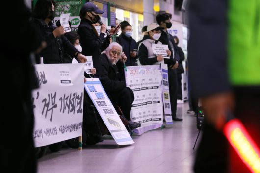 전장연은 20일 오전 8시 시청역 1호선 승강장에서 진행된 기자회견에서 서울시의 장애인 표적 조사 중단과 장애인 탈시설 권리 보장을 요구했다.