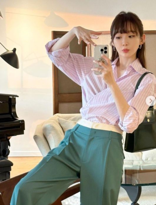 사진 속 강민경은 핑크 컬러의 셔츠에 그린 컬러의 슬랙스를 매치해 세련된 룩을 연출했다. 강민경은 포즈를 취하며 발랄한 분위기를 자아낸다.