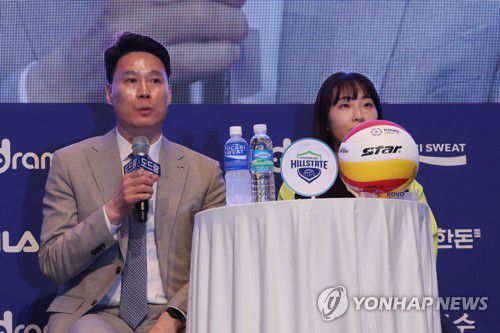 질문에 답하는 현대건설 강성형 감독과 황민경 |