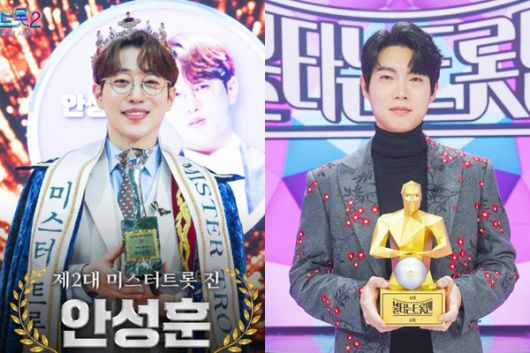 TV 조선 ‘미스터트롯2’ 우승자 안성훈(왼쪽)과 MBN ‘불타는 트롯맨’ 우승자 손태진. 제공 | TV조선, MBN |
