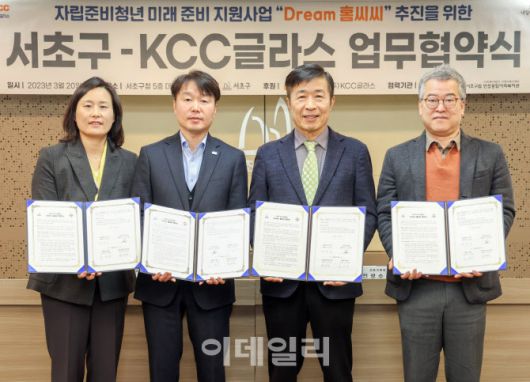 [이데일리 김태형 기자] 전성수(오른쪽 두번째) 서초구청장과 김명주(세번째) KCC글라스 이사가 20일 '자립준비청년 미래 준비 지원사업' (Dream홈씨씨) 업무협약을 체결하고 방배유스센터, 반포종합사회복지관 관계자와 함께 기념촬영을 하고 있다.