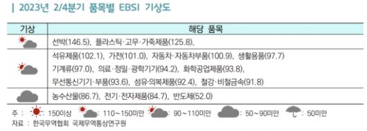 품목별로는 ▲선박 ▲플라스틱·고무·가죽 ▲석유제품 ▲가전 ▲자동차·부품 등이 100을 넘기며 긍정적인 전망이 나왔다. 반면 ▲반도체 ▲전기전자 ▲농수산물 등은 100을 크게 하회했다.