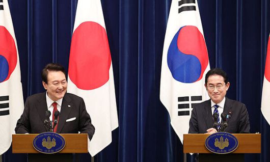 윤석열 대통령이 16일 오후 일본 도쿄 총리 관저에서 기시다 후미오 일본 총리와 공동 기자회견을 하고 있다. 도쿄=연합뉴스 |