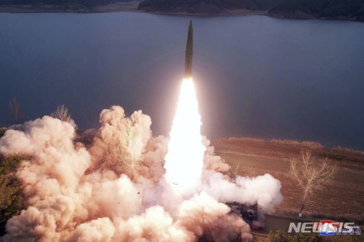 [장연=AP/뉴시스] 유엔 안전보장이사회가 북한의 탄보미사일 발사를 규탄하기 위한 공개회의를 열었으나 중국과 러시아의 반대로 아무런 조치도 취하지 못한채 20일(현지시간) 끝났다. 사진은 북한군이 지난 14일 황해남도 장연 일대에서 지대지 전술탄도미사일을 시험 발사했다면서 발표한 것이다. 2023.03.15. |