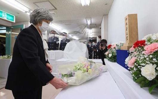 도쿄메트로 가스미가세키역에 마련된 옴 진리교 사린 가스 테러 헌화대에서 유족이 헌화하고 있다.(사진출처=일본 공안조사청) |