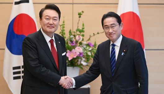 윤석열 대통령(왼쪽)이 지난 16일 일본 수도 도쿄의 총리 관저에서 기시다 후미오 총리와 한·일 정상 소인수 회담에 앞서 기념 촬영을 하며 악수하고 있다. 도쿄=연합뉴스 |