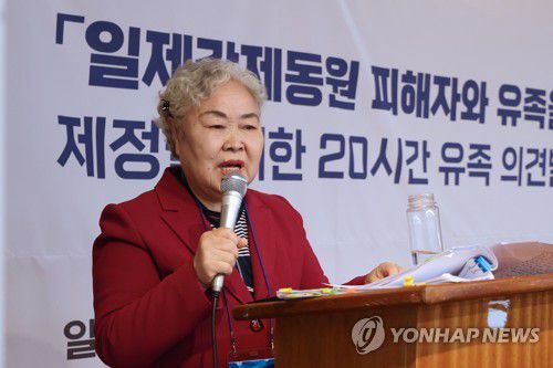 (서울=연합뉴스) 김주성 기자 = 21일 오전 서울 중구 프란치스코 교육회관에서 열린 '일제강제동원 피해자와 유족을 지원하는 특별법' 제정을 위한 20시간 유족 의견 발표회에서 신윤순 사할린 강제동원 억류피해자 한국잔류유족회장이 의견을 발표하고 있다.