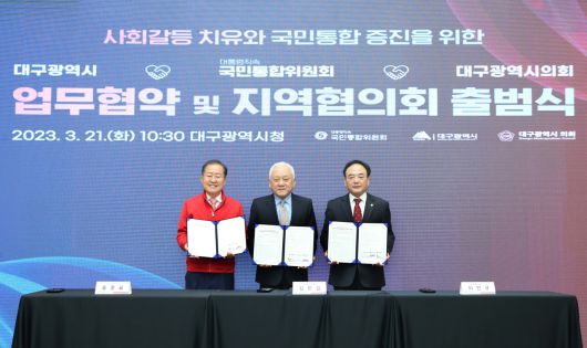 대통령 직속 국민통합위원회가 21일 대구광역시·대구시의회와 국민통합을 증진하기 위한 활동에 손을 맞잡으며 대구지역협의회를 출범시켰다. 이후 이뤄진 1차 회의에서는 대구·경북신공항의 성공적인 건설을 위한 방안 등을 논의했다.