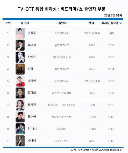 20일 콘텐츠 경쟁력 분석 전문 기관인 굿데이터코퍼레이션에 따르면, 3월 3주차(13일~19일) TV·OTT 통합 출연자 화제성 비드라마 부문 순위에서 안성훈 씨가 1위를 차지했다. 안성훈 씨는 '미스터트롯2'의 결승전에서 최종 우승하면서 제 2대 진(眞)에 등극해 화제를 모았다.