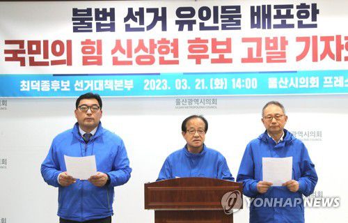 울산 남구의회 보궐선거 민주당 최덕종 후보 선거대책본부는 21일 울산시의회 프레스센터에서 기자회견을 열고 "국민의힘 신상현 후보가 지난 3일과 7일 별도의 선거 홍보 유인물을 만들어 유권자에게 배포했다"고 주장했다.