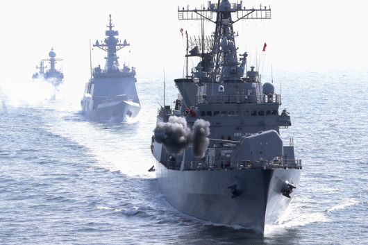 21일 서해상에서 실시한 해군2함대 해상기동훈련에서 을지문덕함(DDHⅠ·3200t급), 서울함(FFG·2800t급), 공주함(PCC·1000t급), 박동혁함(PKG·450t급)이 제2연평해전 교전 시각인 오전 10시25분에 맞춰 함포사격을 하고 있다. 앞에서부터 을지문덕함, 서울함, 공주함, 박동혁함. 해군 제공 |