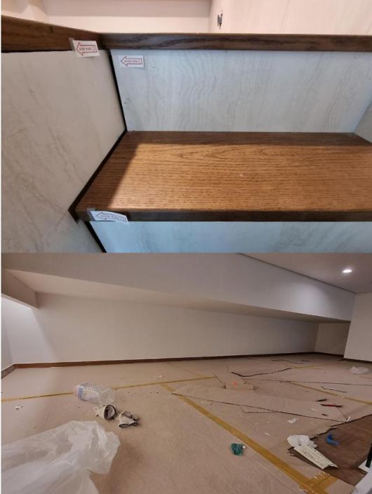 A단지 복층 계단 부분이 벌어져 있다(위), A단지 복층 높이가 낮아 주거용으로 활용이 불가능하고, 공사도 마무리 되지 않고, 쓰레기가 널부러져있다. 아주경제 DB |