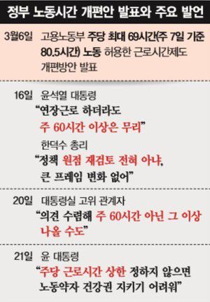 대통령실에서도 혼선을 초래하는 발언이 나왔다. 안상훈 사회수석은 지난 16일 “윤석열 대통령께서는 연장근로를 하더라도 주 60시간 이상은 무리라는 인식을 갖고 있고 적절한 캡(상한)을 씌우지 않은 것에 보완을 지시했다”고 밝혔지만, 나흘 뒤 대통령실 고위 관계자는 기자들과 만나 “의견 수렴을 하면 주 60시간이 아니라 그 이상 나올 수 있다”고 말했다.