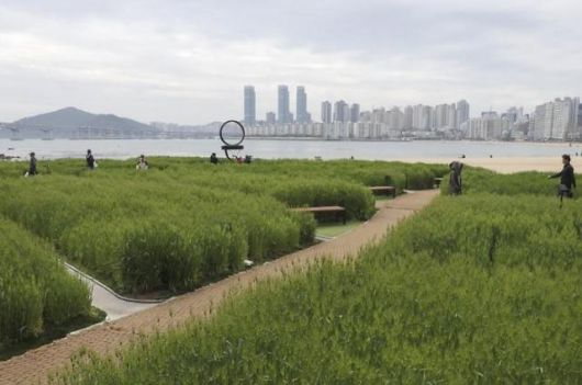 완연한 봄 날씨를 보인 21일 부산 수영구 광안리해수욕장 옆 민락해변공원에 시민들이 초록으로 물든 청보리밭 옆을 지나고 있다. |