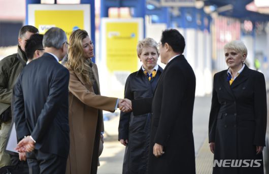 [키이우(우크라이나)=AP/뉴시스]우크라이나 깜짝 방문에 나선 기시다 후미오(岸田文雄) 일본 총리가 21일 키이우에 도착, 기차역으로 마중나온 에미네 자파로바 우크라이나 제1 외무차관과 악수하고 있다. 2023.3.21 |