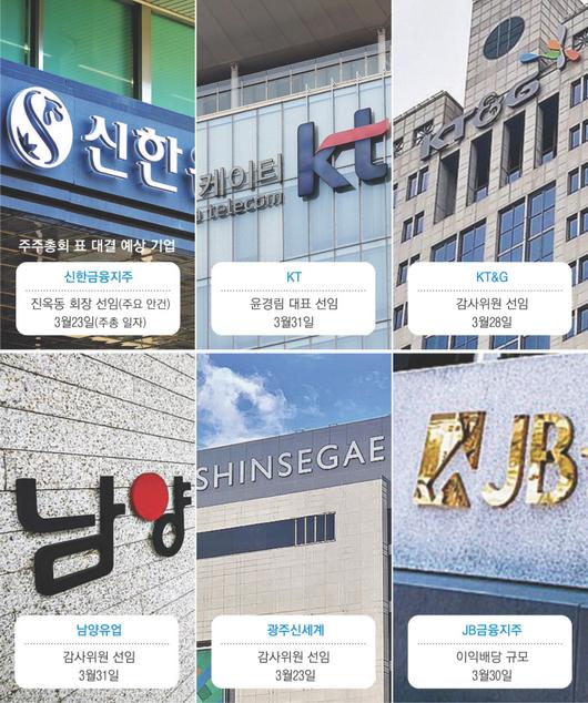 이달 말 집중된 기업들의 정기 주주총회에서는 사내외 이사·감사위원 선임, 이익배당 규모 등 다양한 안건을 놓고 주주들 간 찬반 표 대결이 예상된다. 신한금융지주와 KT는 각각 진옥동 회장과 윤경림 대표 내정을 놓고 국민연금과 외국인·소액주주로 편이 나뉘어 힘겨루기 중이다. 또 행동주의 펀드나 소액주주 제안이 여느 때보다 활발한 가운데 KT&G, 남양유업, 광주신세계, JB금융지주에서도 사측과 일부 주주들이 신경전을 벌이고 있다. 회사 경영권을 둘러싼 주도권 싸움 속에 국민연금, 소액주주, 외국인 중 누가 ‘캐스팅 보트’가 될지 관심이 쏠린다.