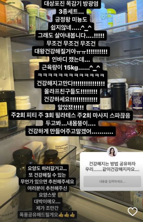 이어 "요양도 하러 갈거고 또 건강해질 수 있는 무언가 있으면 추천해 주세요 여러분이 추천해 주신 요양스팟 대박이에요..조만간 폭풍공유 해드릴게요"라는 글을 더하며 '건강해지는 방법 공유하자. 우리 같이 건강하자요'라며 QnA를 받았다.