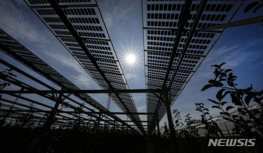 [겔스도르프(독일)=AP/뉴시스]2022년 8월30일 독일 서부 겔스도르프의 사과나무 농장에 특수 태양 전지판이 설치돼 있다. 한화솔루션의 계열사로 태양광 패널을 제조하는 큐셀이 미 조지아주에 25억 달러(3조1200억원)이 넘는 자금을 투자, 공장을 짓고 2500명을 신규 고용해 보통 미국 밖에서 제조되는 부품을 생산할 것이라고 11일 발표했다. 2023.1.11 |