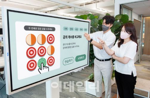 SK케미칼 구성원들이 AI기반 인지기능개선 프로그램 ‘사운드 마인드’를 시연해보고 있다. |