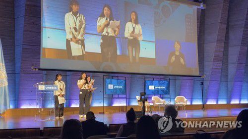 (광주=연합뉴스) 김재선 기자 = 광주시교육청은 민주·인권 국제교류단 학생들이 지난 21일 유네스코 파리 본부에서 열린 '유네스코 글로벌 마스터 클래스' 국제 무대에서 발표를 진행했다고 22일 밝혔다. 2023.3.22 [광주시교육청 제공. 재판매 및 DB 금지]