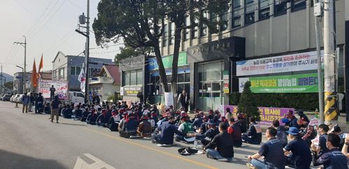 (제천=연합뉴스) 권정상 기자 = 민주노총 충북본부는 22일 제천시 봉양읍 봉양농협 앞에서 노조원 200여명이 참여한 가운데 집회를 열어 이 농협 홍성주 조합장을 상대로 노조 탄압과 갑질·횡포를 중단할 것을 요구했다.
