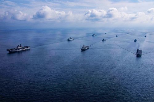 쌍룡훈련 참가한 한·미 해군 상륙기동부대 - (서울=연합뉴스) 지난 21일 ‘23 쌍룡훈련’에 참가 중인 한·미 해군 상륙기동부대가 경북 포항 근해에서 경계 엄호 전력의 호위 하에 작전 수행지역으로 이동하는 호송 작전을 펼치고 있다. 2023.3.22 [해군 제공. 재판매 및 DB 금지] photo@yna.co.kr |