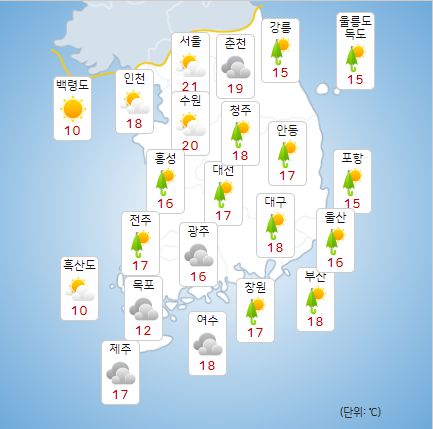 - 24일 아침최저기온은 0~12도, 낮최고기온은 10~19도가 되겠다.