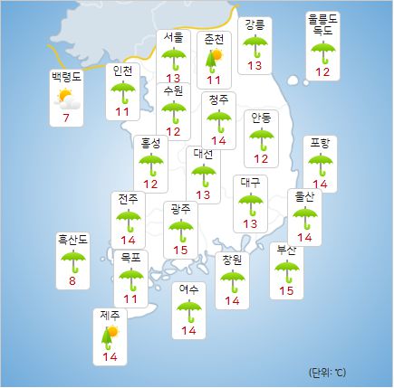 - 23일 아침최저기온은 9~15도, 낮최고기온은 13~23도가 되겠다.