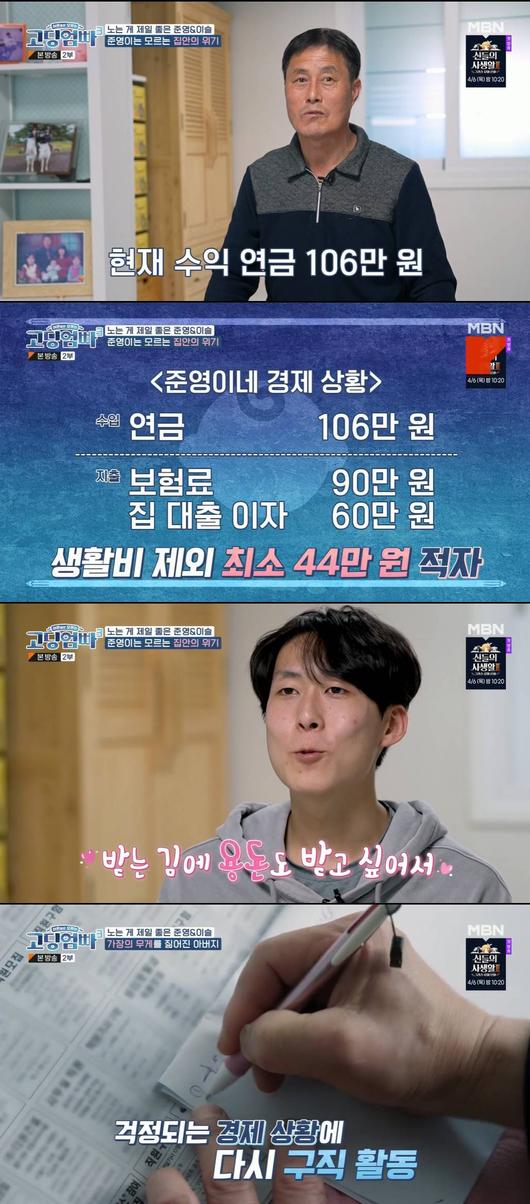 아버지는 "퇴직 이후 수입은 국민연금 106만원이다. 그걸로 생활하고 있는 상황이다"라며 "현재는 마이너스 통장으로 유지하고 있는 실정이다"라고 전해 걱정을 샀다.