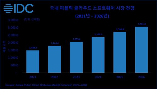 23일 한국IDC의 보고서 '국내 퍼블릭 클라우드 소프트웨어 시장 전망, 2022∼2026년'에 따르면 지난해 해당 시장 규모는 1조7천844억원으로 집계됐다.