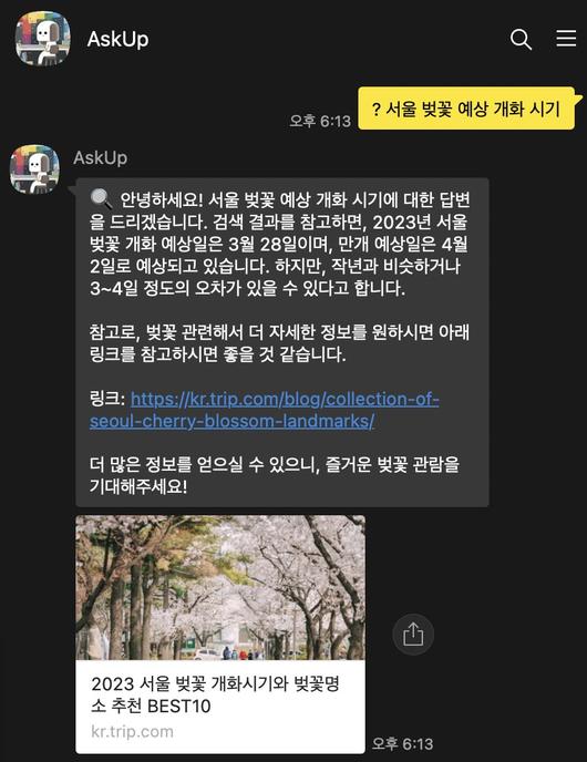 이번 업데이트를 통해 카톡 채널 채팅창에 '?' 문구 뒤 검색어를 붙여 입력하면 검색 결과를 요약해서 답을 주고 출처까지 확인할 수 있다. 검색 엔진은 카카오와 구글을 활용했다. 예를 들어 "? 올해 개화 시기"라고 입력하면 해당 내용을 링크와 함께 알려주는 식이다.