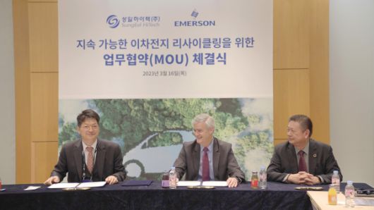 2차전지 리사이클링 전문기업 성일하이텍이 한국에머슨이 지난 16일 서울 코엑스에서 열린 이차전지산업 전문 전시회 ‘인터배터리 2023’에서 업무협약(MOU)을 체결했다고 23일 밝혔다.