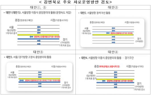 대안 2는 서울 방향 청색 차선을 활용해 일산방면 1개 차로 감소, 대안 3은 서울/경기방향 고정식 중앙분리대를 활용, 중앙버스전용차로를 출근 시간 뿐 아니라 퇴근 시간(오후 5~7시)에도 운영하는 것이다. 대안 4는 경기구간(아차산대교 교량 시작 전)만 서울 방향 이동식 중앙분리대를 활용하는 것이다.
