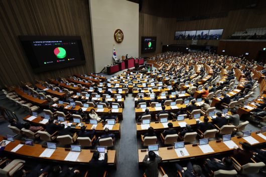 23일 오후 열린 국회 본회의에서 양곡관리법 일부개정법률안(대안)에 대한 수정안이 통과되고 있다. [연합] |