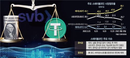 24일 탈중앙화금융 데이터 플랫폼 디파이라마에 따르면 전날 기준 USDT의 스테이블코인 시장점유율은 59.1%로 최근 18개월 만에 최고 수준이다. USDT 시가총액은 787억 1000만 달러로 2위 USDC(343억 3000만 달러)를 두 배 이상 따돌렸다. 지난해 5월 전체 암호화폐 시가총액 6위까지 올라섰던 테라USD(UST)가 추락한 뒤 USDT와 USDC·BUSD의 3강 구도가 굳혀지는 듯했지만 USDC와 BUSD에 잇따라 탈이 생기며 USDT로 급격히 무게중심이 쏠리고 있다.