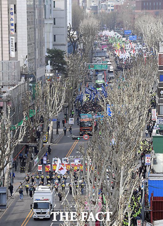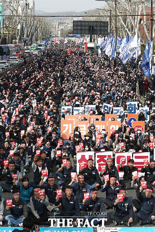 [더팩트ㅣ임영무 기자] 전국민주노동조합총연맹(민주노총)의 '민생파탄 검찰독재 윤석열 심판 투쟁선포대회'가 25일 오후 서울 종로구 이화사거리에서 열린 가운데 집회 참가자들이 구호를 외치고 있다.