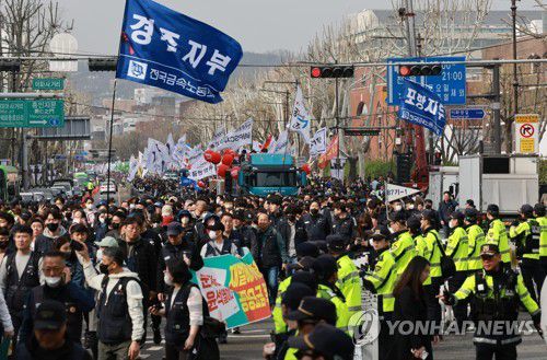 (서울=연합뉴스) 홍해인 기자 = 민주노총 주최로 25일 서울 종로구 대학로 일대에서 열린 '민생파탄·검찰독재 윤석열 심판 투쟁선포대회' 참가자들이 집회를 마친 뒤 시청 앞 서울광장을 향해 행진하고 있다. 2023.3.25