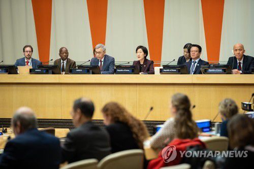 (서울=연합뉴스) 한화진 환경부 장관(가운데)이 24일(현지시간) 미국 뉴욕 UN본부에서 열린 '과학기반의 글로벌 물 평가' 토론회에 참석해 기조연설을 하고 있다. 2023.3.25 [환경부 제공. 재판매 및 DB 금지] photo@yna.co.kr ▶제보는 카카오톡 okjebo▶연합뉴스 앱 지금 바로 다운받기~▶네이버 연합뉴스 채널 구독하기 <저작권자(c)연합뉴스. 무단전재-재배포금지.>