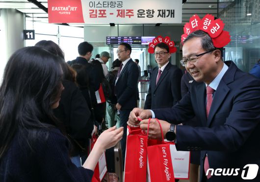 (서울=뉴스1) 박정호 기자 = 조중석 이스타항공 대표(오른쪽)과 유상종 경영총괄 전무, 이경민 커머셜본부장 및 승무원들이 26일 오전 김포국제공항 국내선 탑승 게이트에서 승객들에게 기념 굿즈를 전달하고 있다. 이스타 항공은 오늘부터 김포-제주 노선을 시작으로 3년 만에 운항을 재개했다. 2023.3.26/뉴스1