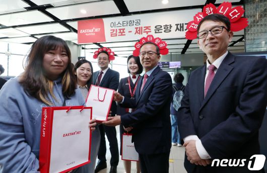 (서울=뉴스1) 박정호 기자 = 조중석 이스타항공 대표(오른쪽 두 번째)과 유상종 경영총괄 전무, 이경민 커머셜본부장 및 승무원들이 26일 오전 김포국제공항 국내선 탑승 게이트에서 승객들에게 기념 굿즈를 전달하고 있다. 이스타 항공은 오늘부터 김포-제주 노선을 시작으로 3년 만에 운항을 재개했다. 2023.3.26/뉴스1