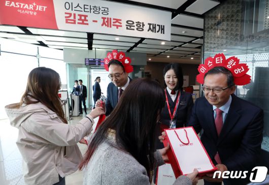 (서울=뉴스1) 박정호 기자 = 조중석 이스타항공 대표(오른쪽)과 유상종 경영총괄 전무, 이경민 커머셜본부장 및 승무원들이 26일 오전 김포국제공항 국내선 탑승 게이트에서 승객들에게 기념 굿즈를 전달하고 있다. 이스타 항공은 오늘부터 김포-제주 노선을 시작으로 3년 만에 운항을 재개했다. 2023.3.26/뉴스1