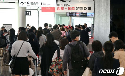 (서울=뉴스1) 박정호 기자 = 26일 서울 강서구 김포공항 국내선 탑승동 게이트에서 이스타항공 승객들이 비행기 탑승을 위해 줄을 서 있다. 이스타 항공은 오늘부터 김포-제주 노선을 시작으로 3년 만에 운항을 재개했다. (공동취재) 2023.3.26/뉴스1