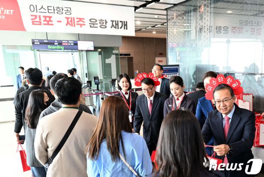 (서울=뉴스1) 박정호 기자 = 조중석 이스타항공 대표(오른쪽)와 유상종 경영총괄 전무, 이경민 커머셜본부장 및 승무원들이 26일 오전 김포국제공항 국내선 탑승 게이트에서 승객들에게 기념 굿즈를 전달하고 있다. 이스타 항공은 오늘부터 김포-제주 노선을 시작으로 3년 만에 운항을 재개했다. (공동취재) 2023.3.26/뉴스1